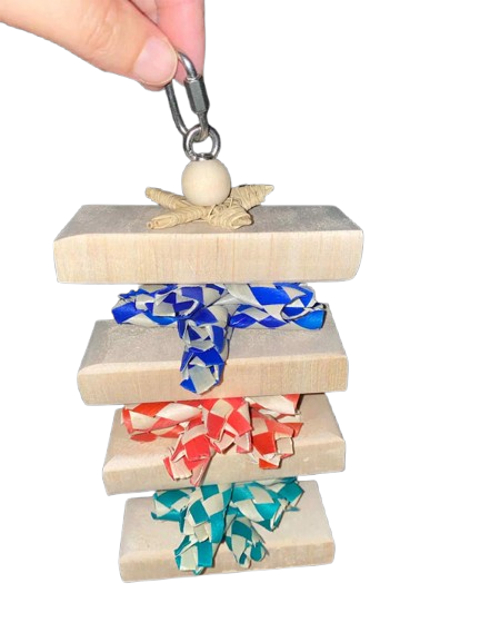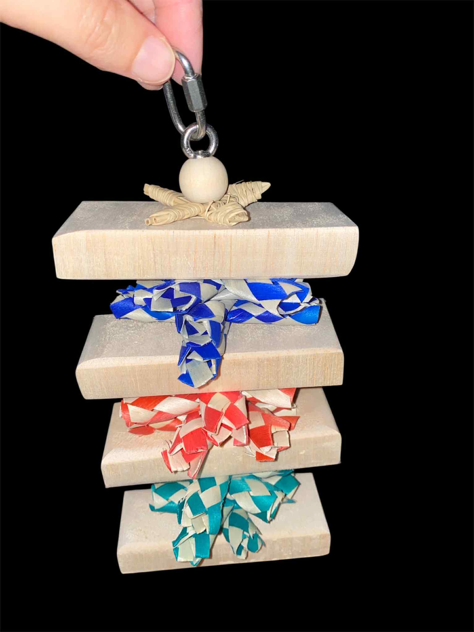Deze kleurrijke balsa- en palmtraktatie is een feestje voor nieuwsgierige snavels! Vier dikke balsa blokken worden speels afgewisseld met vrolijk gekleurde palm vingertraps – perfect om te slopen, te knagen én te ontdekken.