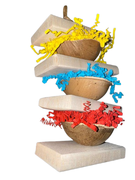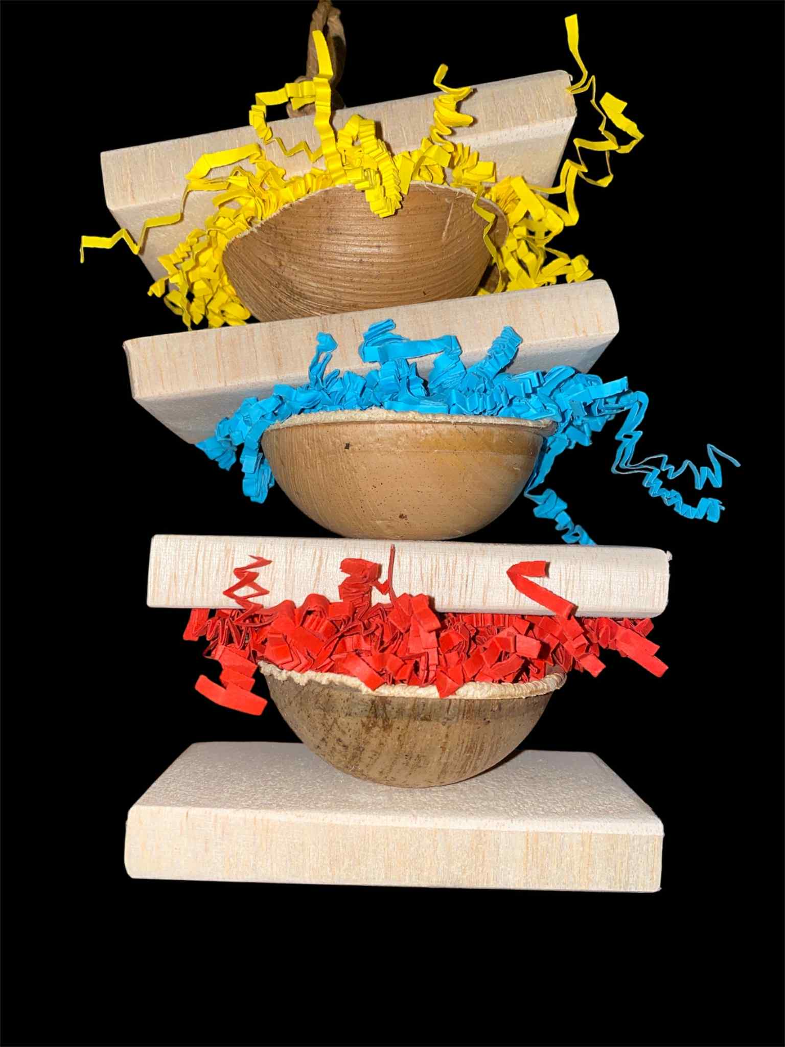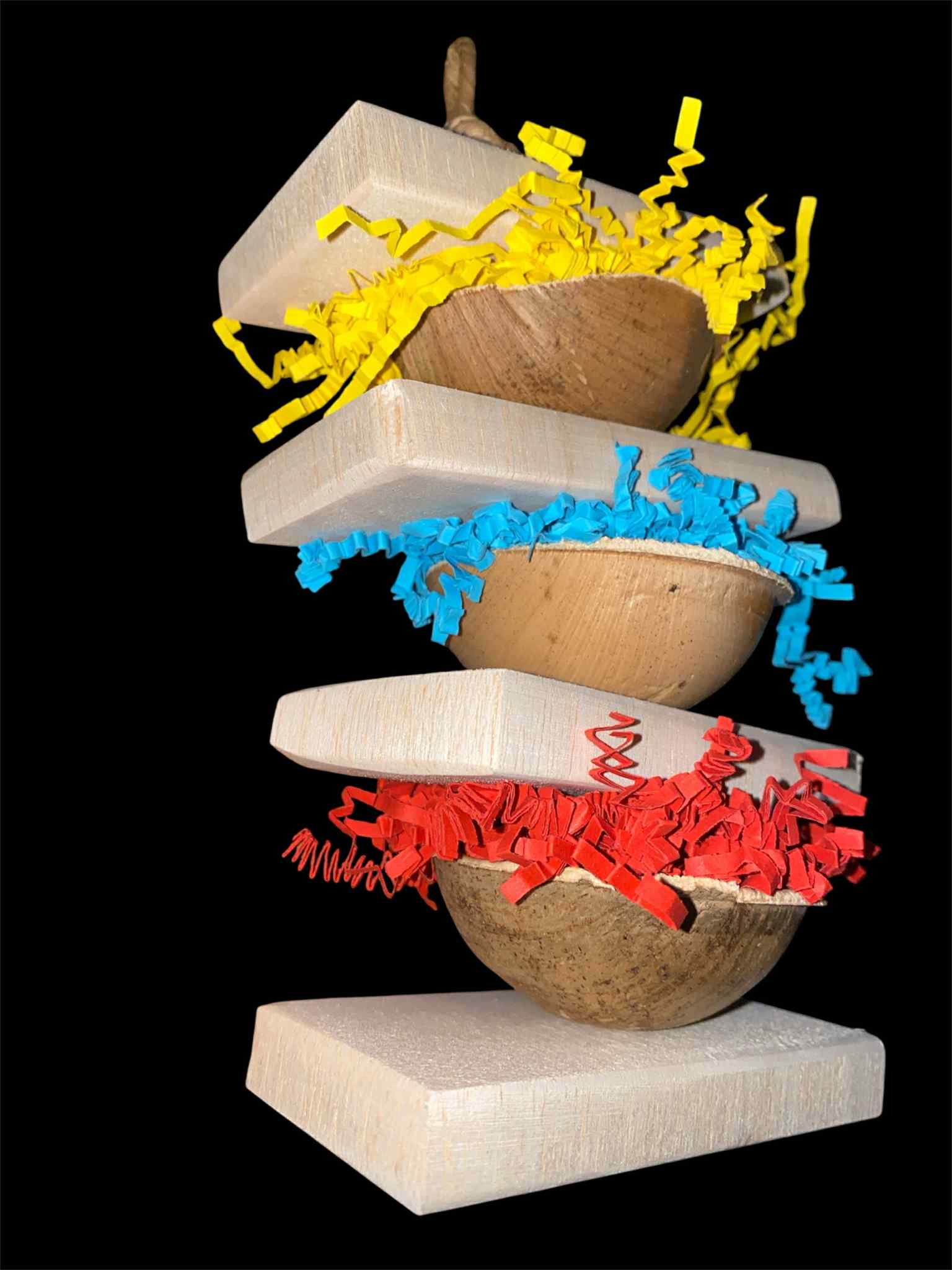 BalsaVreugde is 23 cm lang en 11 cm breed en zit boordevol kleurrijke papiersnippers die tussen de balsa en palm cupjes verstopt zijn. Perfect voor nieuwsgierige parkieten en kleine tot medium papegaaien die graag bezig zijn met hun snavel.