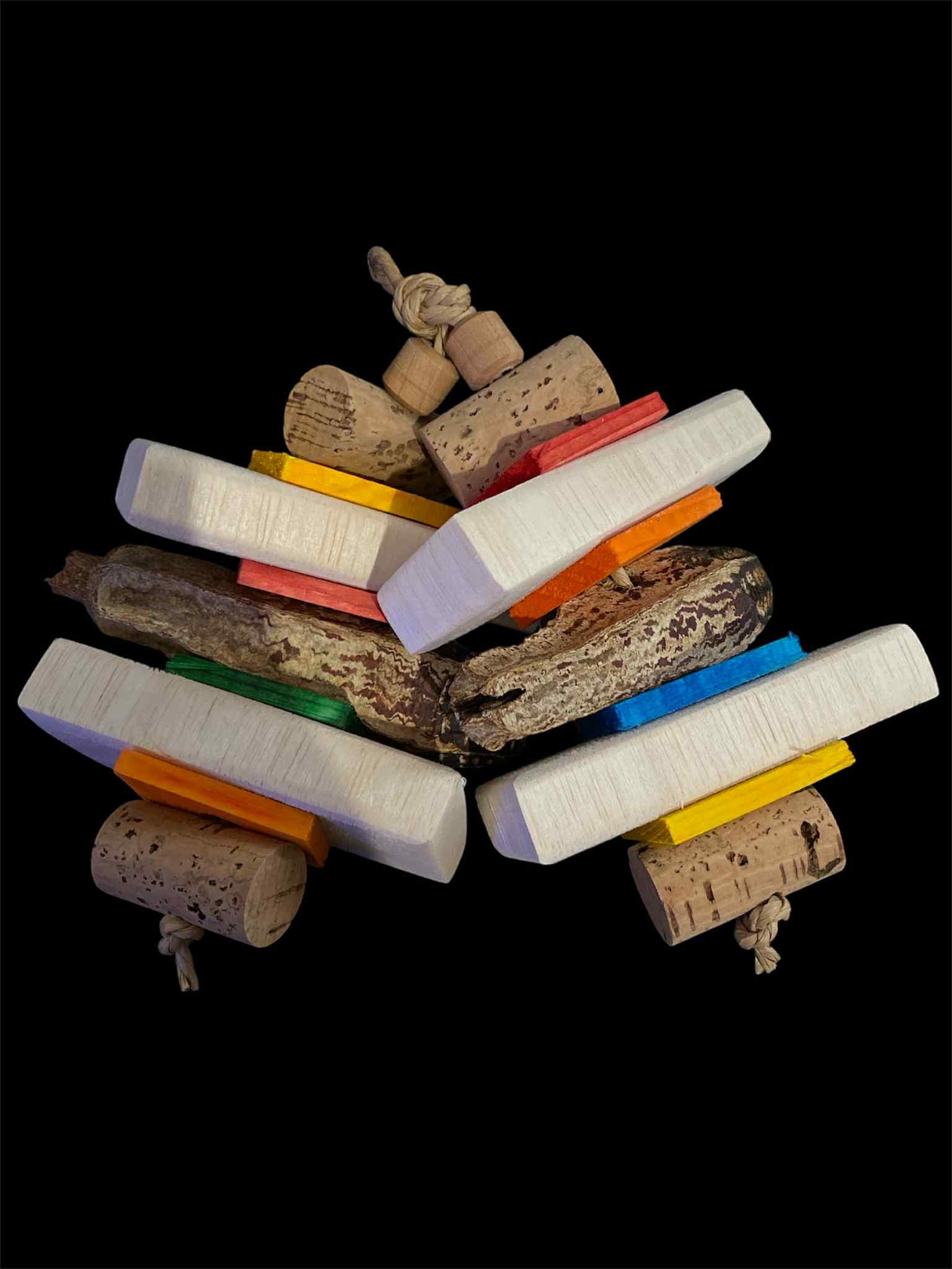 Gemaakt van zachte balsa, knapperige mahogany pods, natuurlijk kurk en vrolijk gekleurde houtjes – perfect om aan te trekken, te slopen en lekker op los te gaan. Ideaal voor parkieten, caiques en kleine papegaaien die houden van licht materiaal dat makkelijk te manipuleren is.