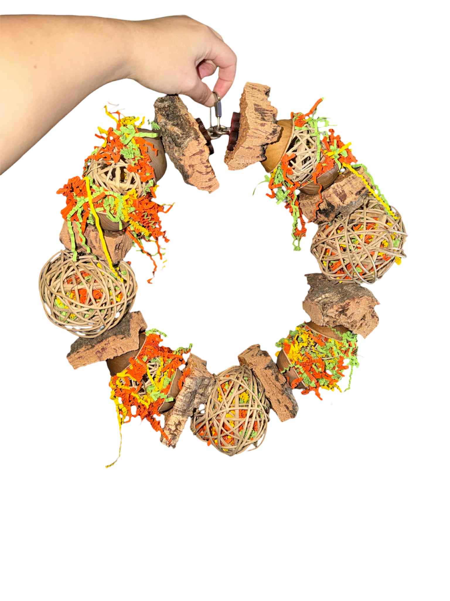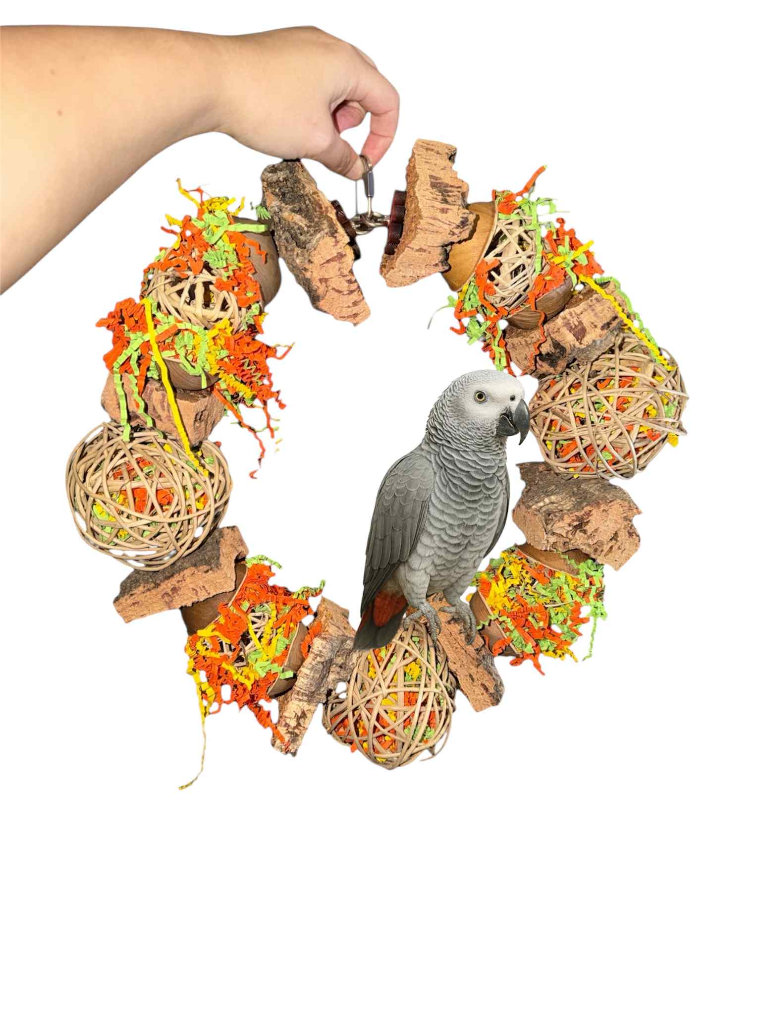 De Jungle Krans is dé blikvanger van FensieVogels! Deze indrukwekkende RVS speelring van 84 cm is helemaal rijk gevuld met natuurlijke materialen zoals kurk, palm, wilgenballen, papiersnippers.