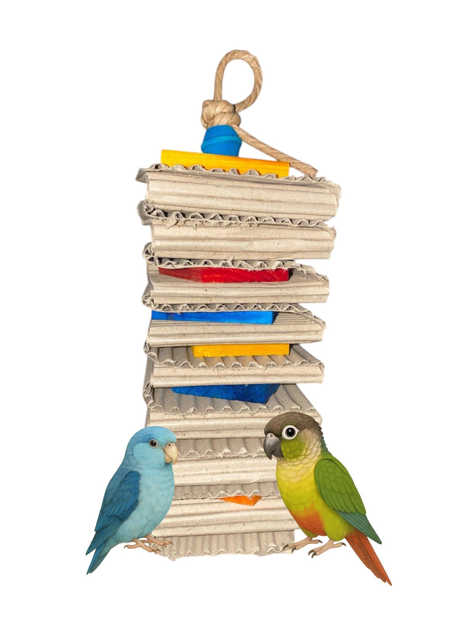 Wat een feest voor kleine ontdekkers! Dit vrolijke speeltje zit boordevol ribbelkarton met daartussen verstopt… gekleurde houten schijfjes! Perfect om lekker op los te gaan met de snavel. Slopen, knabbelen, trekken en peuteren – dit speeltje houdt jouw kleintje gegarandeerd lekker bezig.