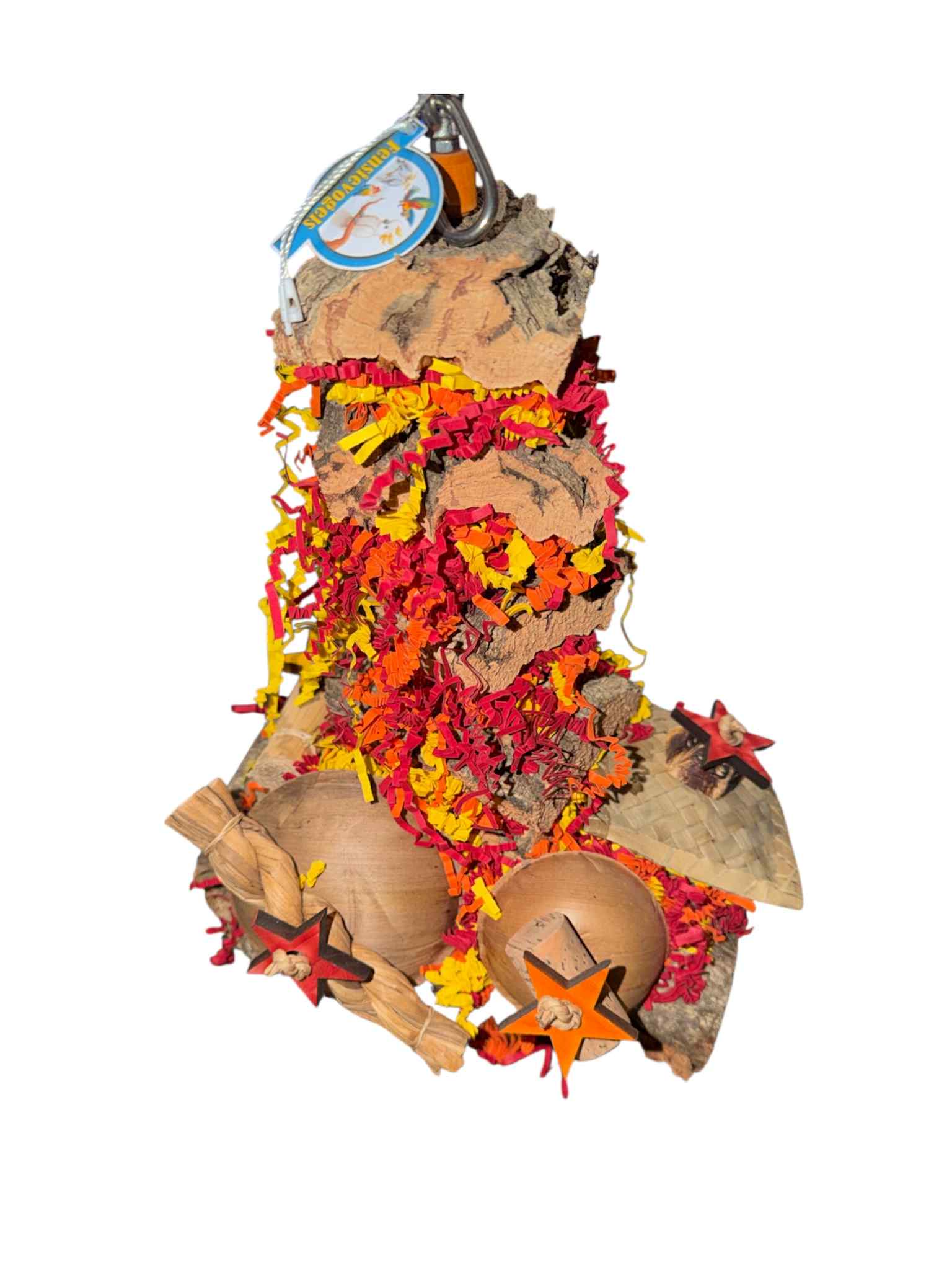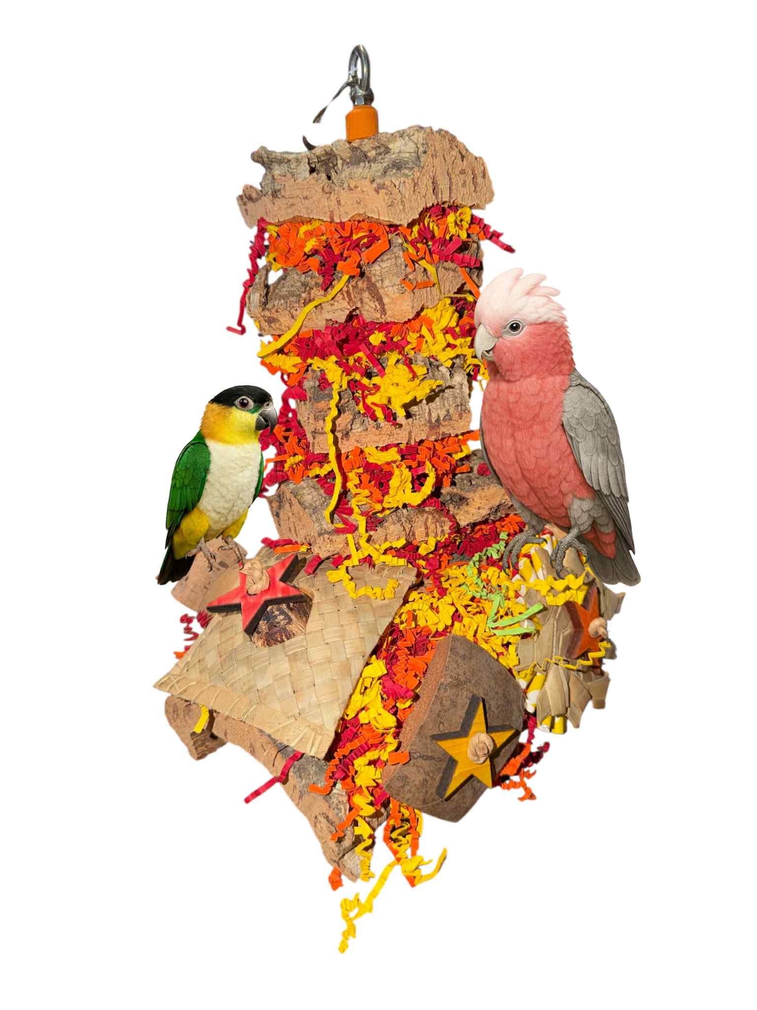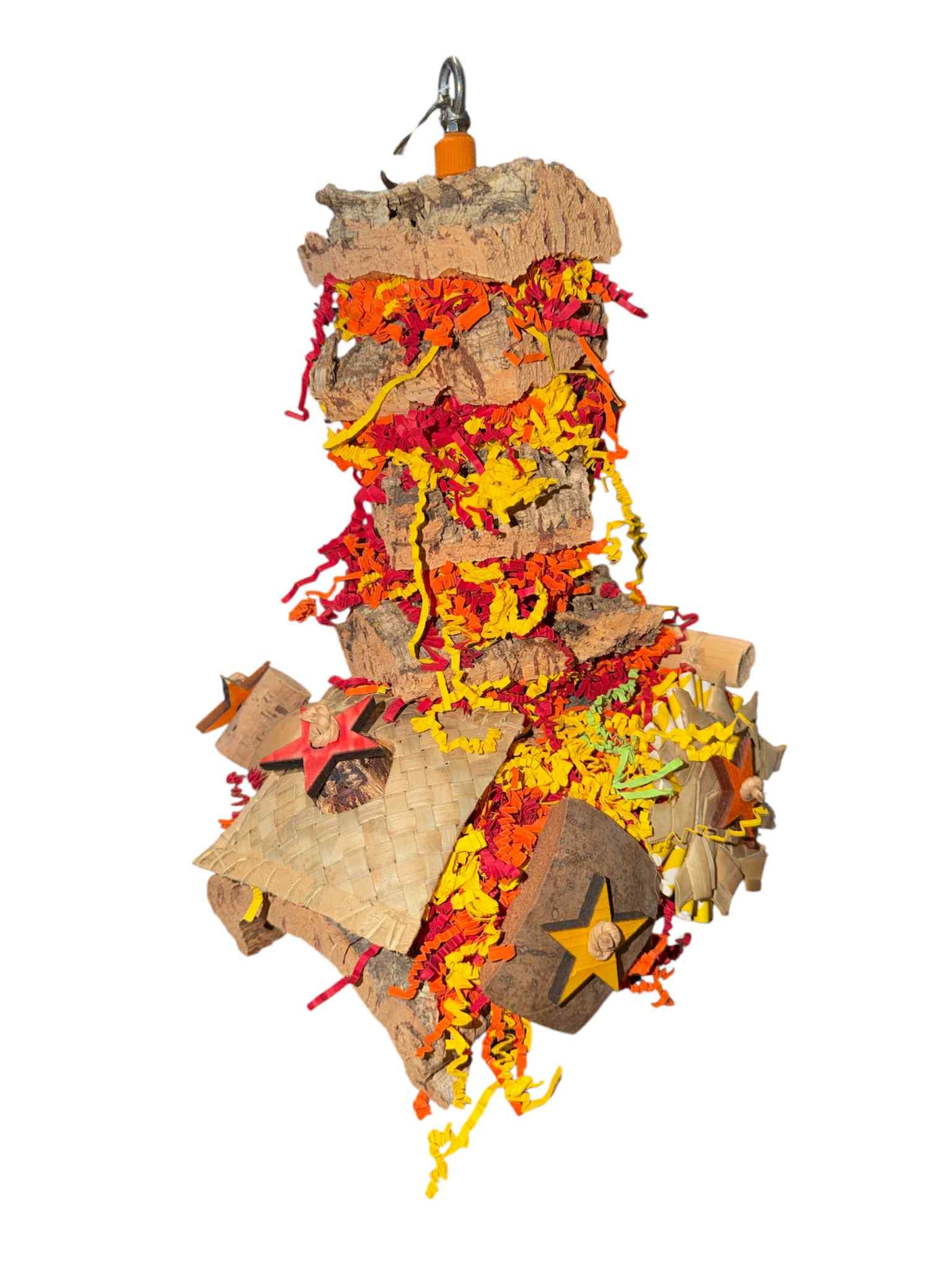Stevige RVS spies gevuld met dikke stukken kurk, palm, sterretjes en kleurrijke papiersnippers. Perfect voor sloopvogels zoals caiques, bonte boeren en grijzenroodstaard kleine kaketoe's amezone edel papegaaien.