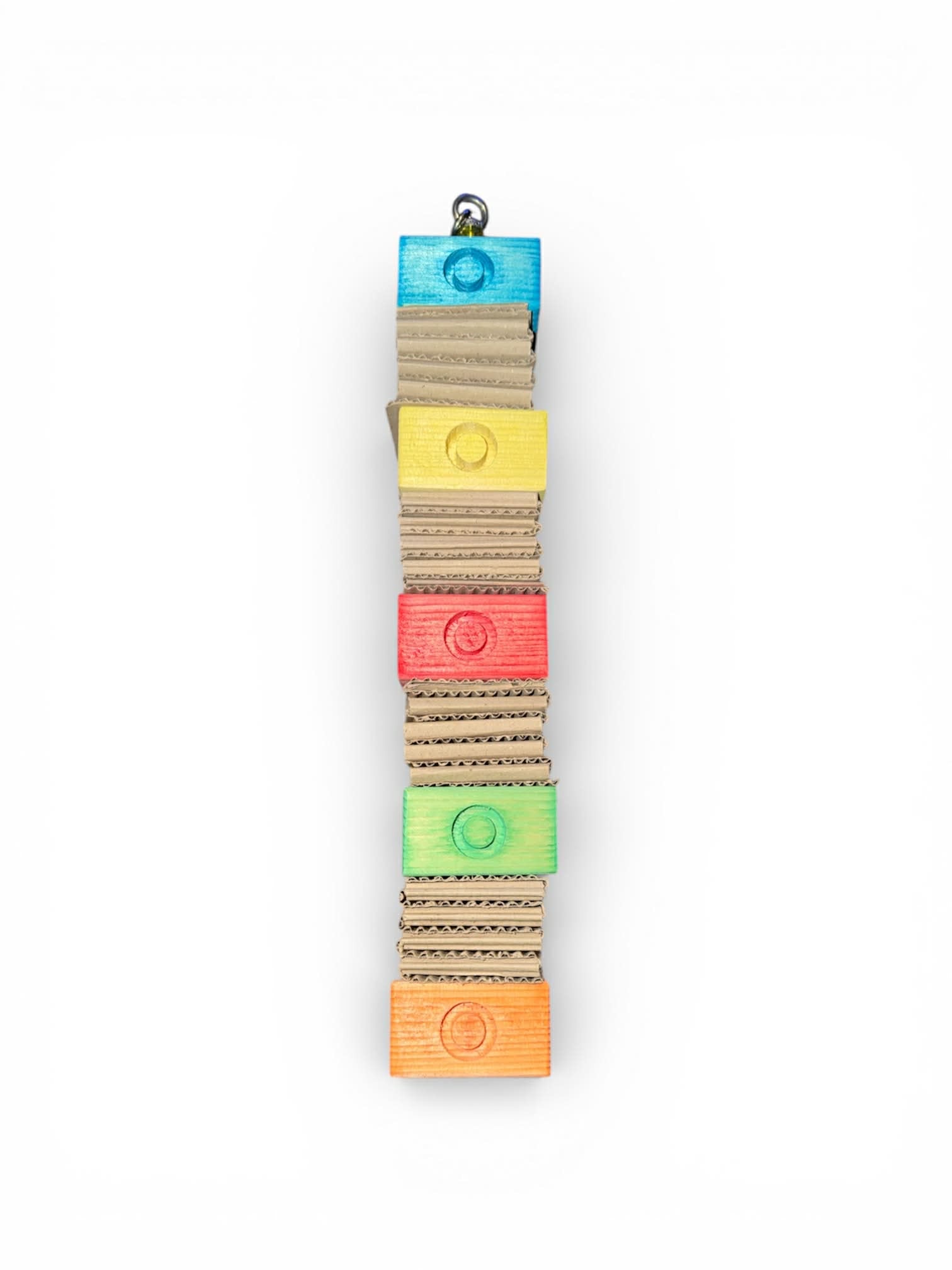 Tussen de blokken kun je makkelijk wat lekkers verstoppen. Zo verandert dit speeltje elke keer weer in een nieuw zoek- en sloopmoment. Ideaal voor slimme, krachtige vogels die niet snel klaar zijn.