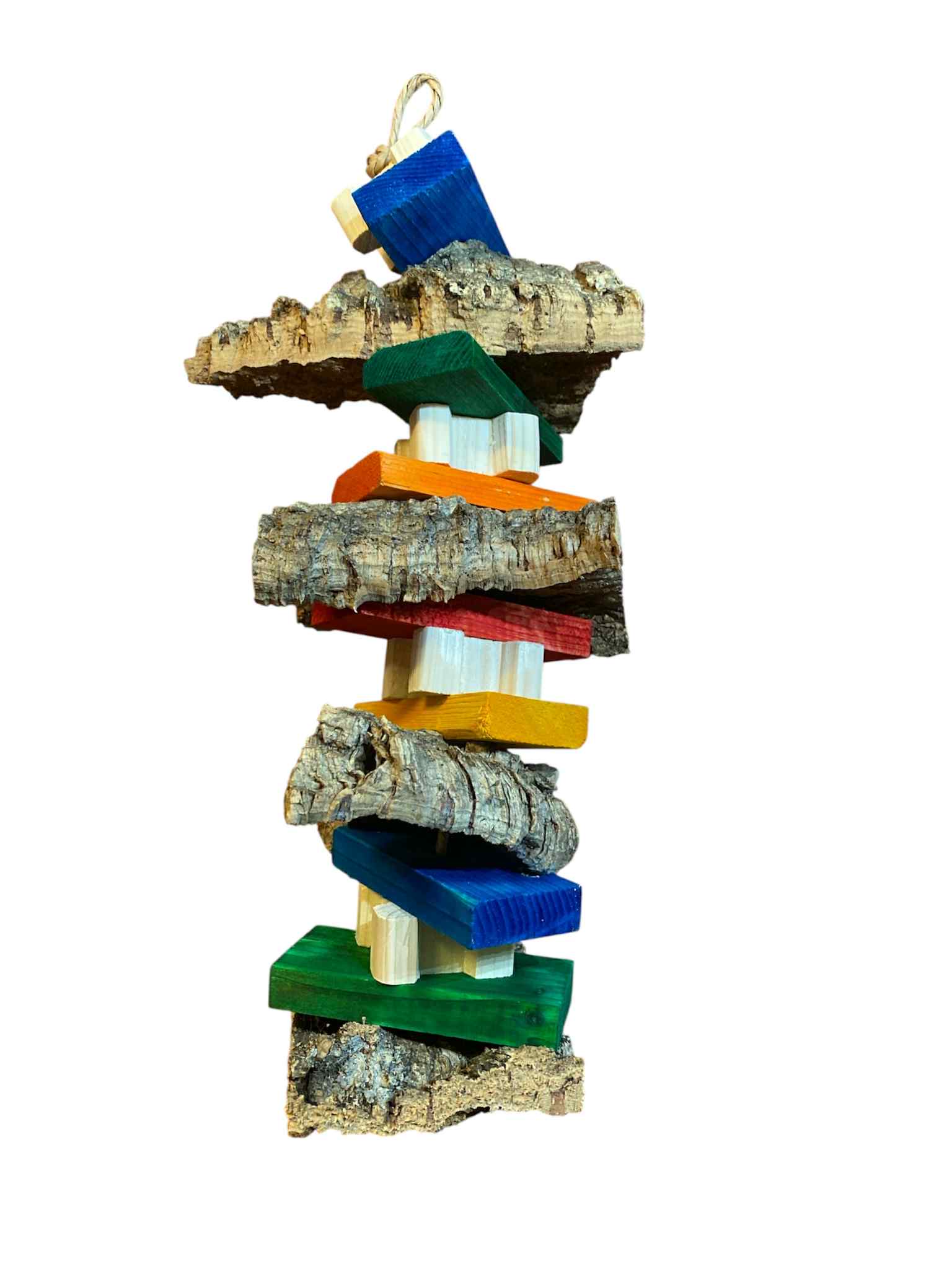 Deze medium speeltje is speciaal ontworpen voor caiques, bonte boeren, grijze roodstaarten, kleine kaketoe’s en amazones. Het combineert stevig vurenhouten blokjes en zachte kurkstukjes, samen met papiersnippers aan een flexibel papiertouw, waardoor het speeltje lekker wiebelt en slingert terwijl je vogel ermee speelt.